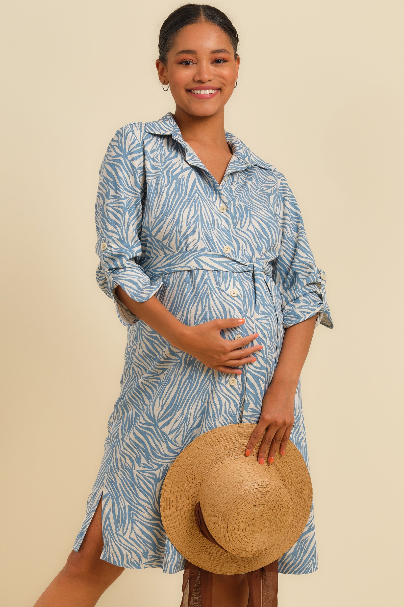- Umstandskleid aus gemischtem Leinen-Viskose-Stoff mit dezentem Muster