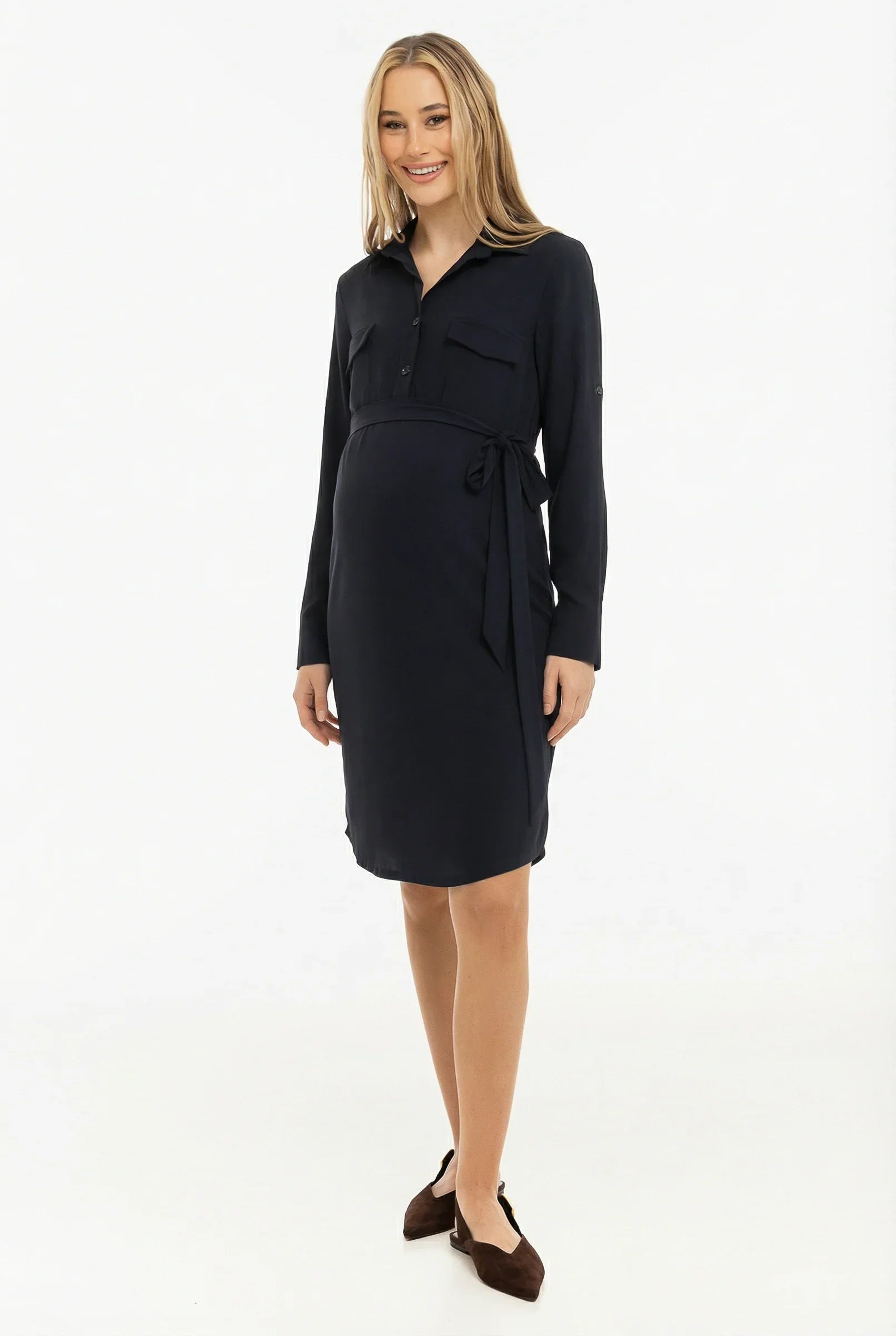 Elastisches Hemdblusenkleid aus Travel-Stoff. Mit einem komfortablen Bindegürtel, der deine Taille betont, trägst du dieses Kleid während der gesamten Schwangerschaft – und auch danach!