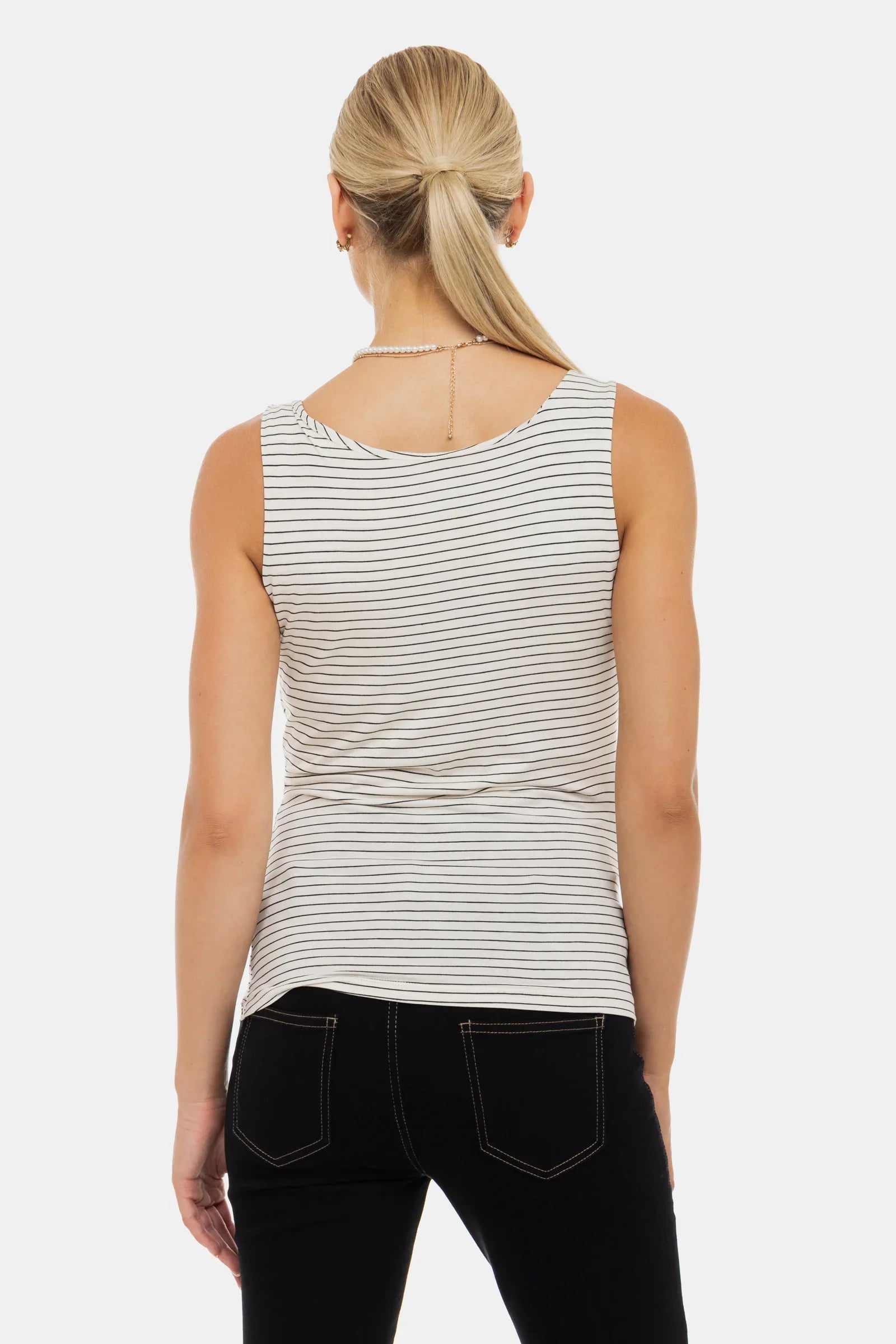 Top aus weichem, gestreiftem Viskosejersey mit elegantem Drapé-Ausschnitt und doppellagigem Vorderteil für diskretes Stillen – bequem, schmeichelhaft und für jede Phase geeignet.