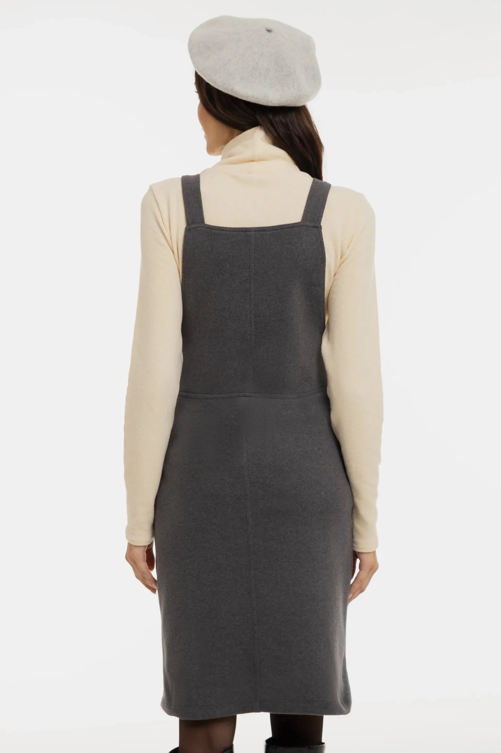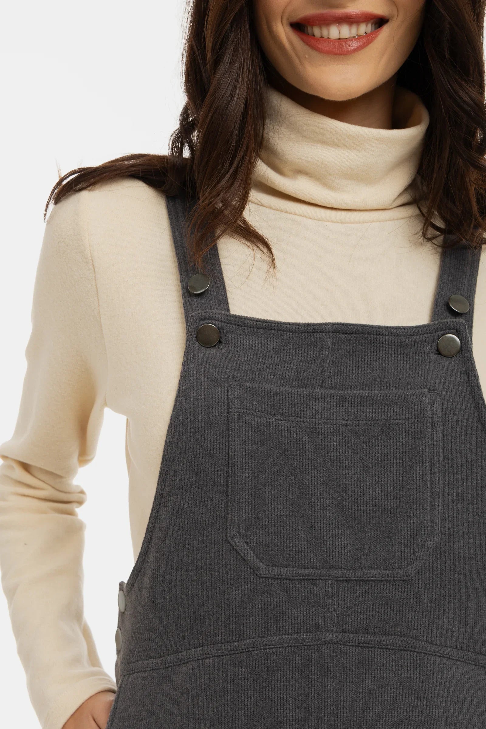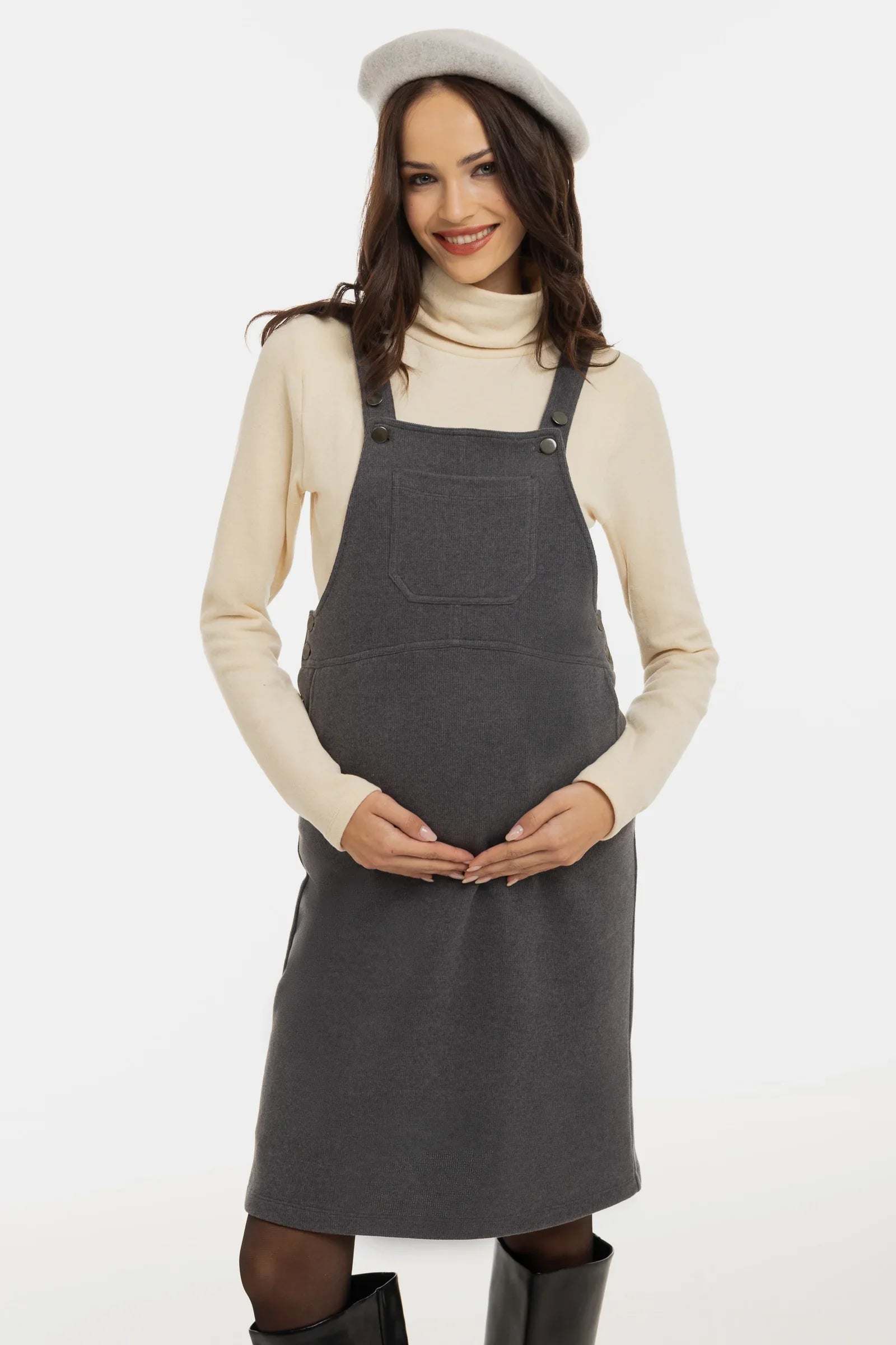 Gestricktes Umstands-Latzkleid mit cleanem Silhouette – perfekt kombinierbar mit einem klassischen Rollkragenpullover oder einer Bluse.