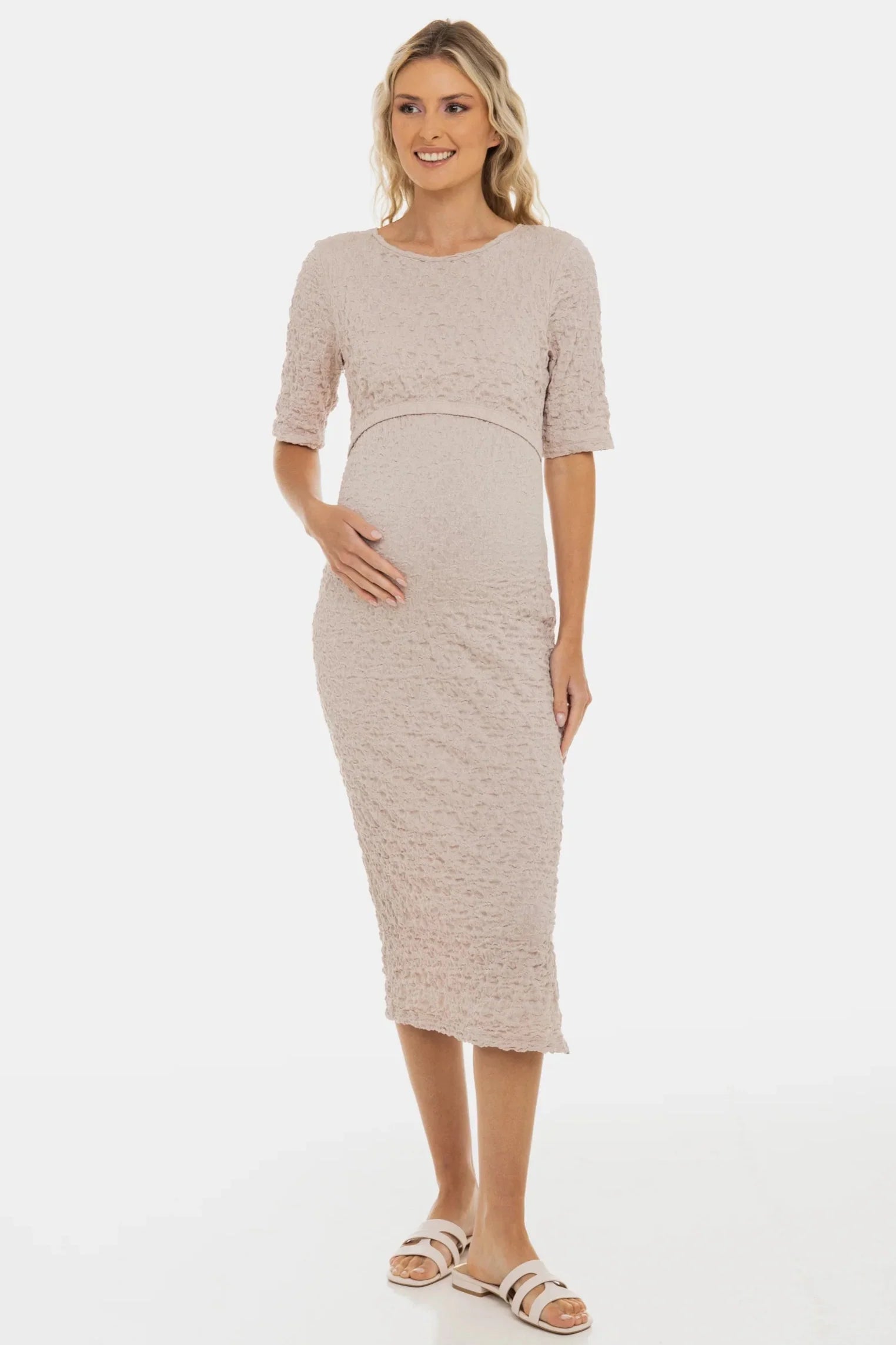 Langes figurbetontes Umstands- und Stillkleid mit Crinkle-Effekt – Sand