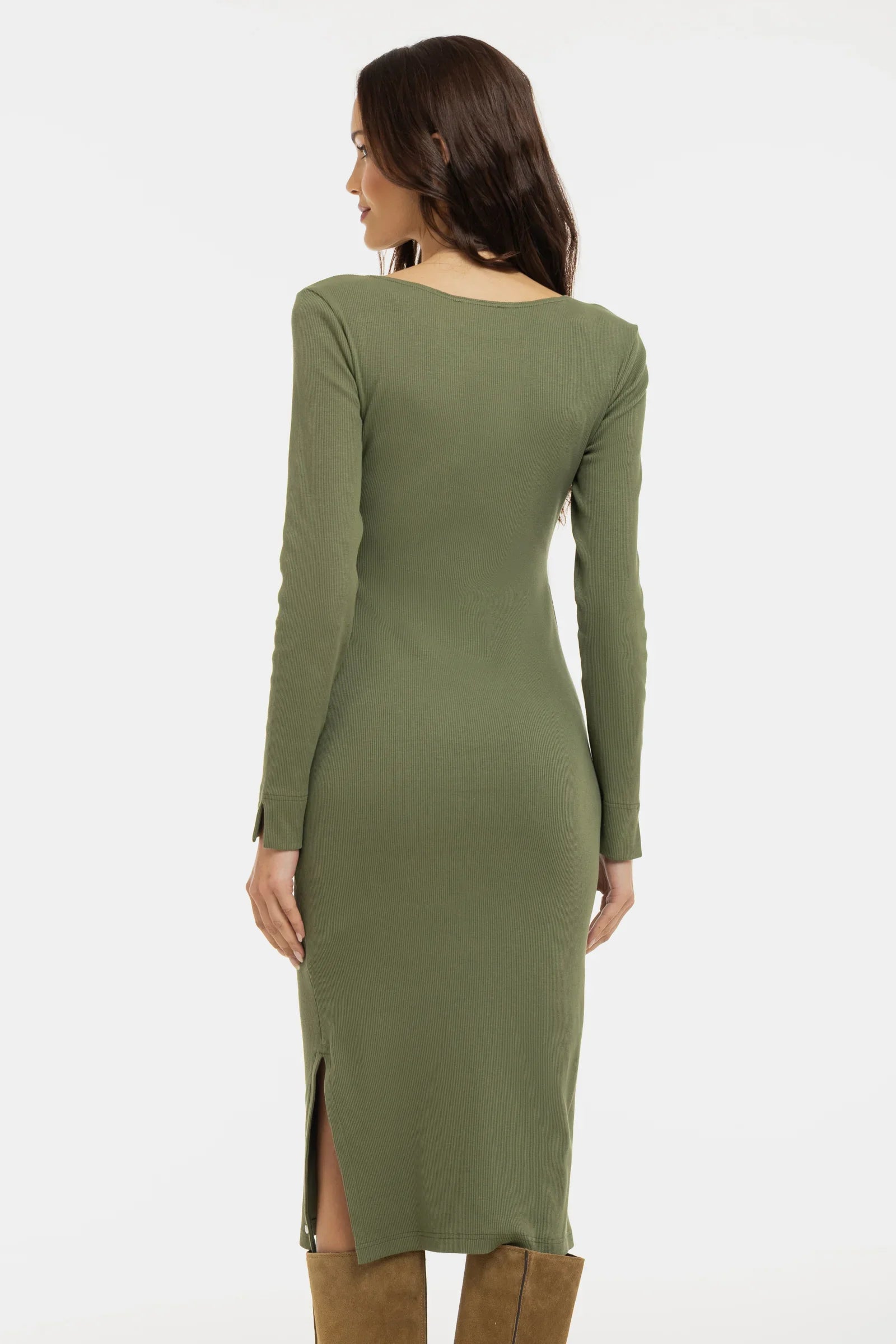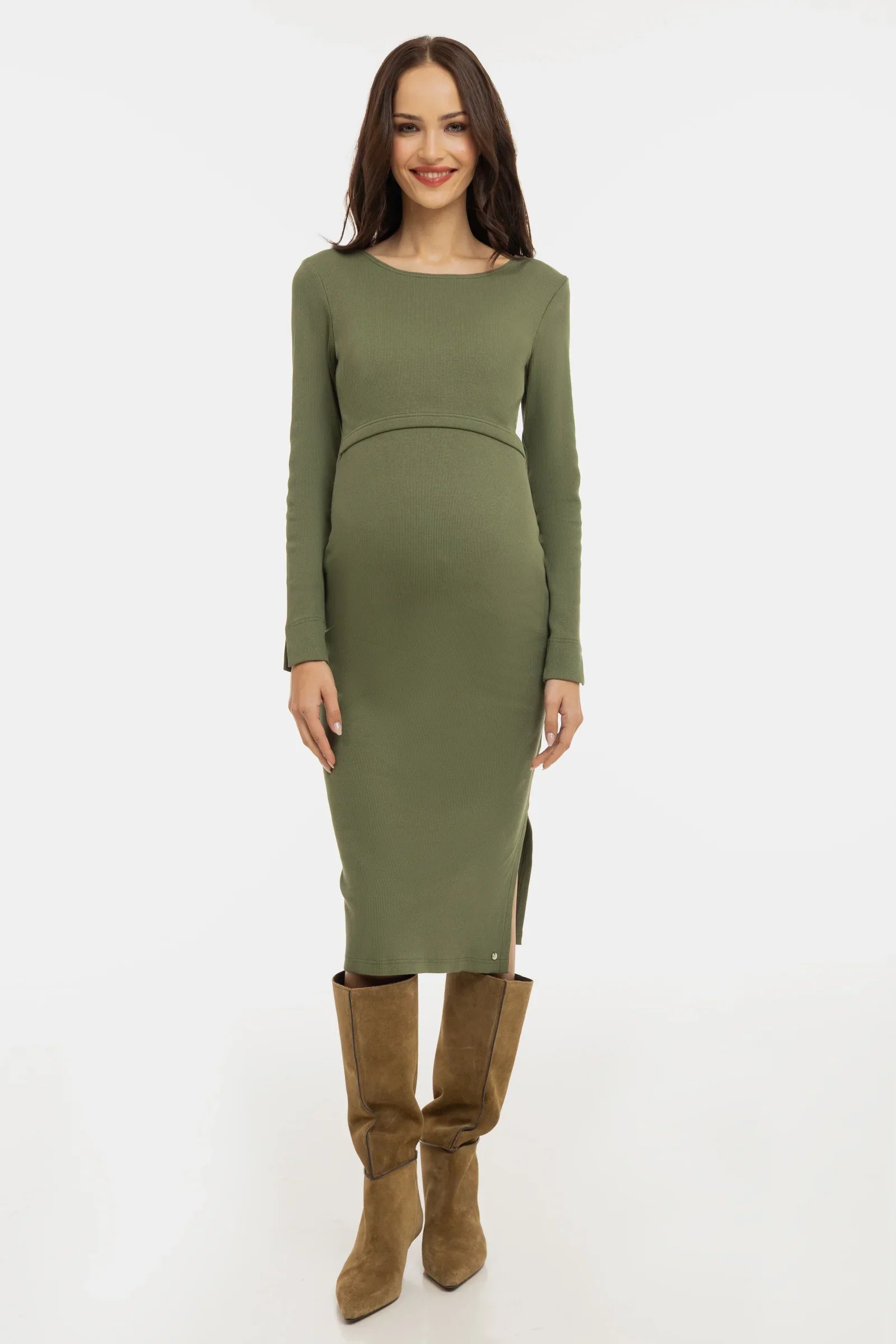 Langes geripptes Umstands- und Stillkleid mit langen Ärmeln – Khaki
