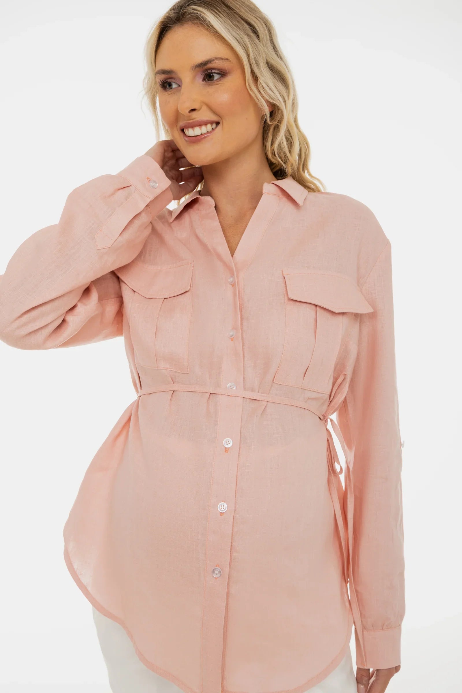 Luftige Bluse aus 100 % Leinen mit abnehmbarem Bindeband, Brusttaschen und Knopfleiste für den Stillzugang. Perfekt für die Schwangerschaft und danach.